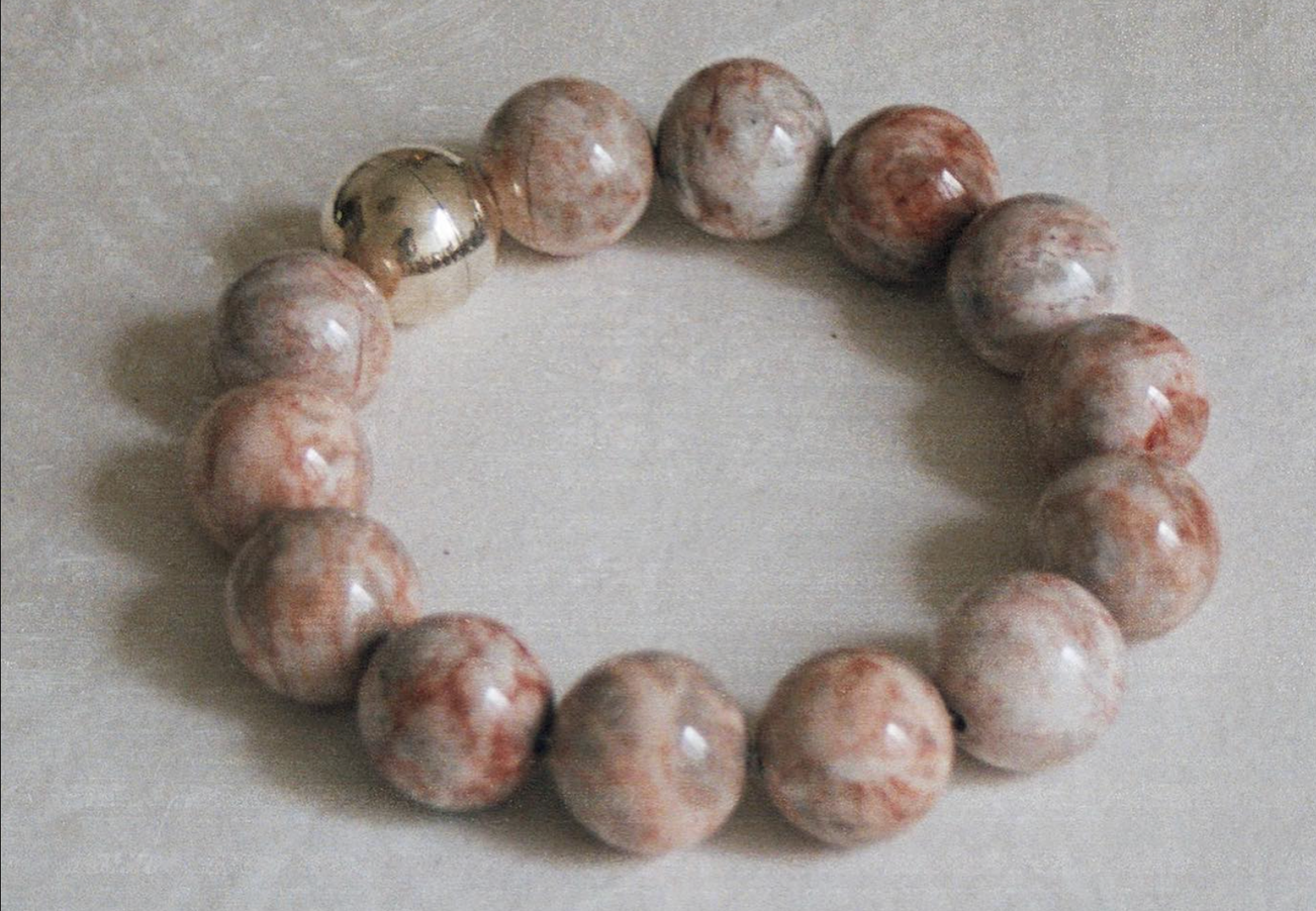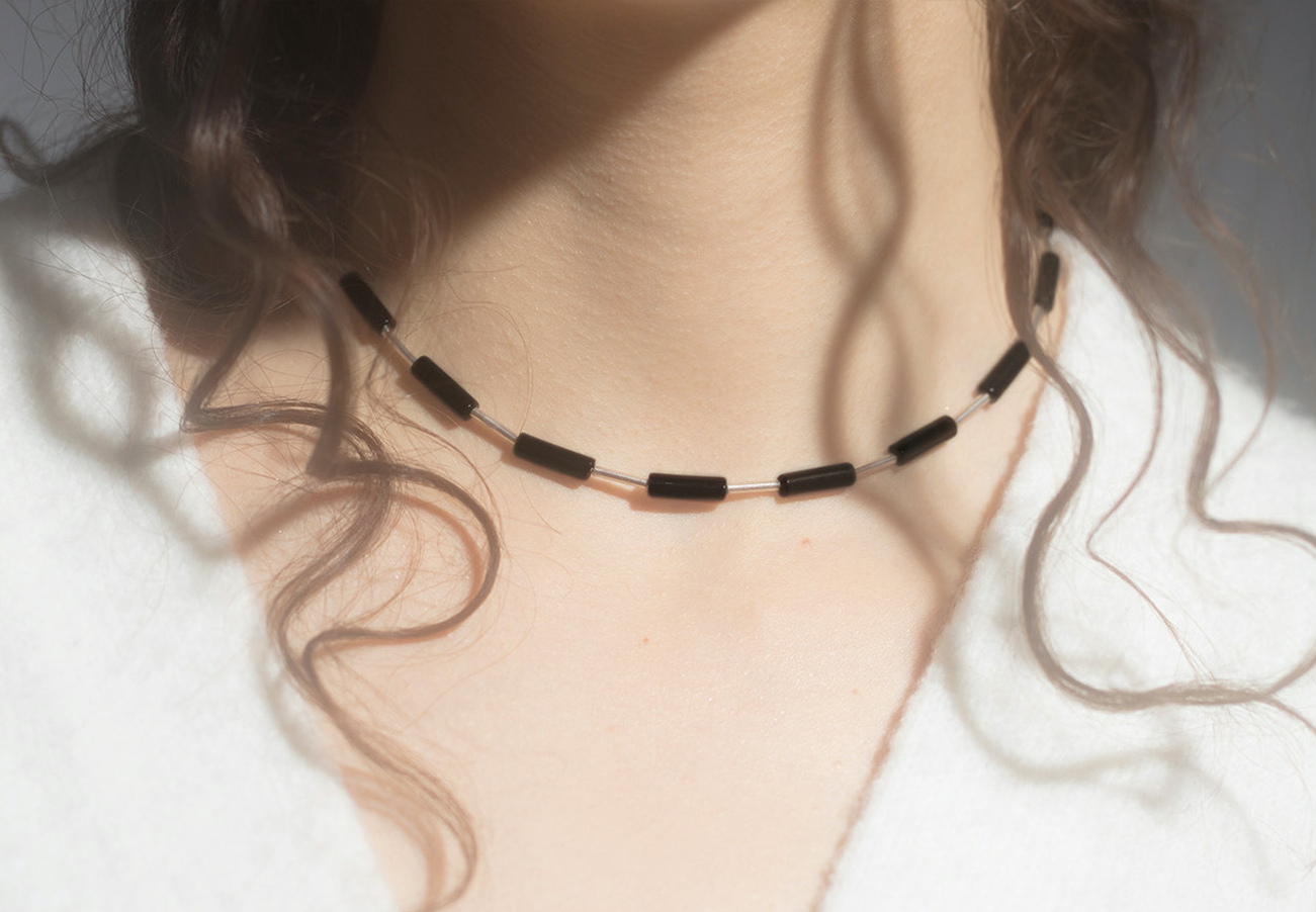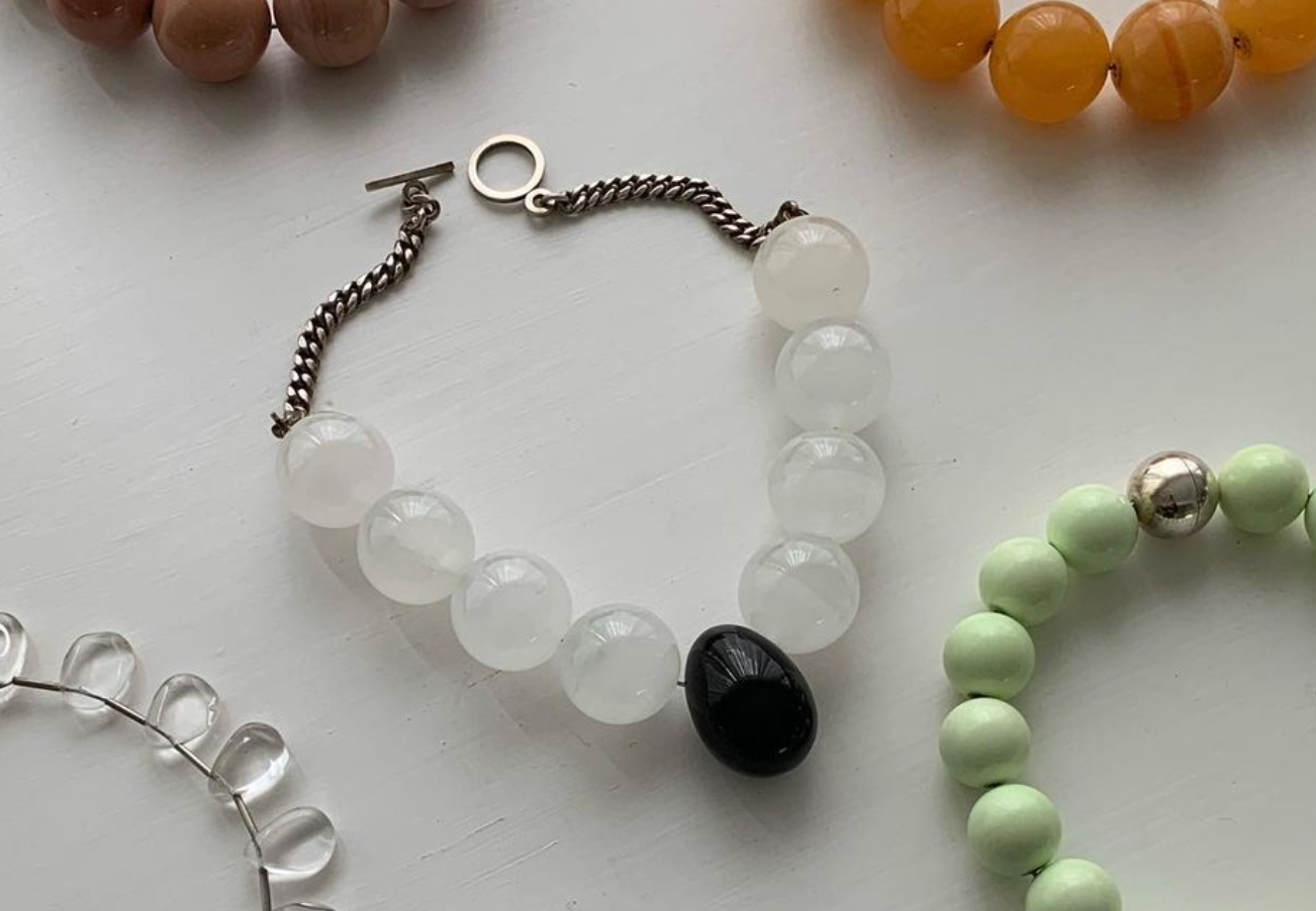 One of Serpentine’s signature pieces is a large beaded necklace made in several variations of rare stones. The construction is striking — large, planetary spheres of afghan lapis lazuli, nephrite, and orange calcite, bound by silver tubing, sitting stoically on the wearer’s collarbone. These pieces carry a subtle weight and cool temperature to them, encouraging calm and body awareness. “People often mention that when they wear a necklace of mine, they become more aware of their posture. I believe that anything that makes you be more aware, at least for a few minutes in your day, will definitely have a positive impact on your life.”